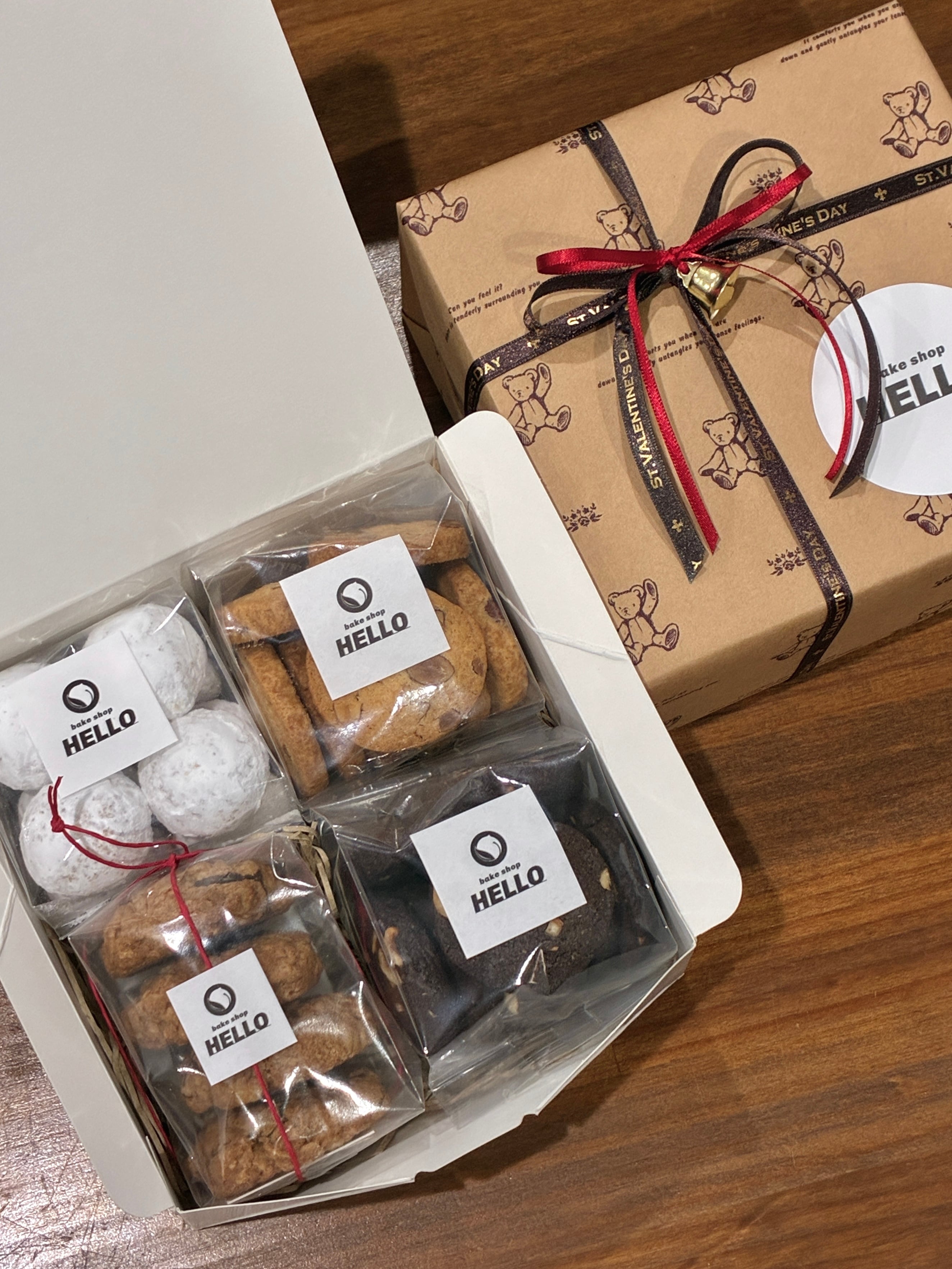 HELLOの人気クッキー4種類をリボンがけの箱でお届けいたします。